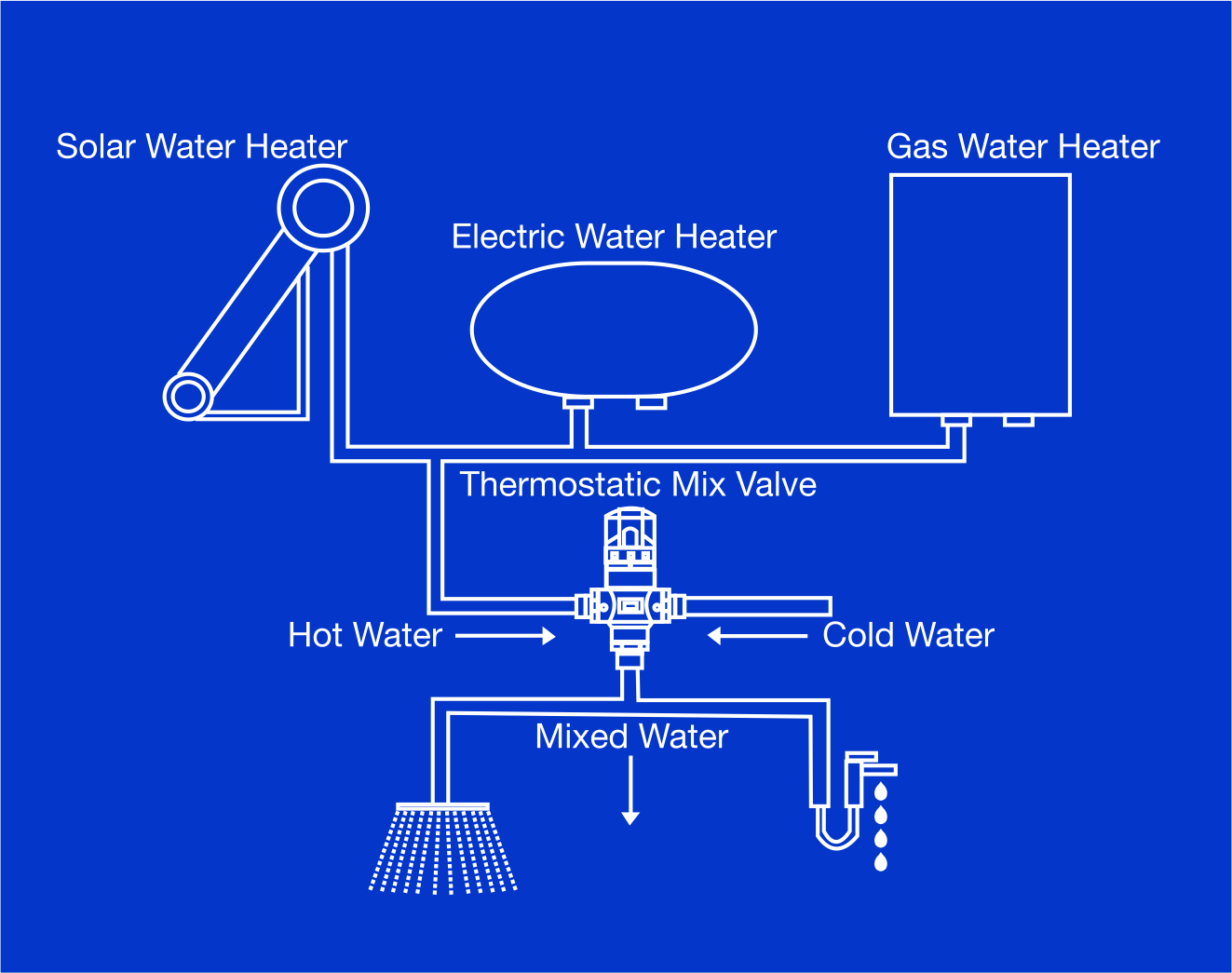 A Thermostatic Mixing Valve is a valve that blends hot water (stored at temperatures high enough to kill bacteria) with cold water to ensure constant, safe outlet temperatures preventing scalding. They also shut-off rapidly in the event of a hot or cold supply failure to prevent scalding or thermal shock.