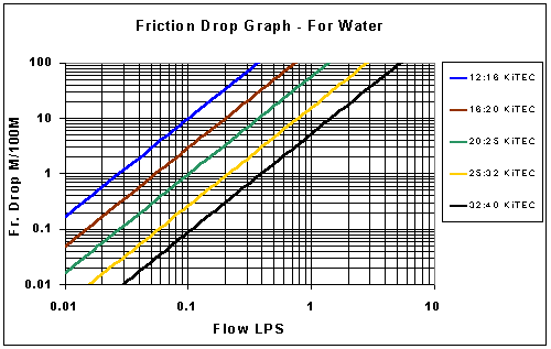 Because of smooth inside surface KiTEC pipe is scale free and gives higher and consistent flow throughout the service life. Friction drop properties for KiTEC pipes are represented by following graph.